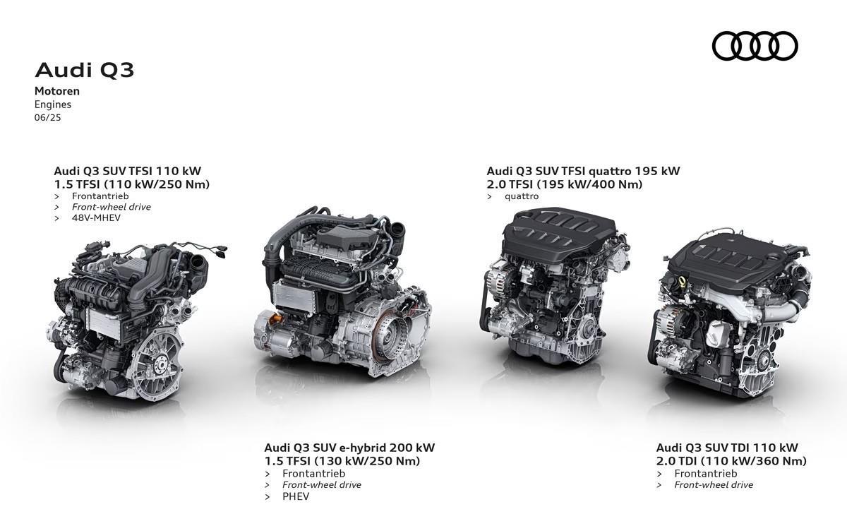 动力方面,奥迪Q3目前在海外提供了柴油、汽油以及插混动力可选。其中,在最有可能引入到国内的汽油版中,其提供了1.5TFSI、2.0TFSI中高功率版本三种规格,传动均匹配7速S-tronic双离合变速箱,三者分别提供110kW、150kW、195kW最大功率,后两者可搭载quattro智能四驱系统。不过,海外车型均会匹配支持25km/h以下纯电驱的MHEV Plus双电机全域智混系统,而国内或许仅有2.0TFSI高功率车型会布局该系统,真想要跟那么多高端新能源抢些市场,恐怕在家族里普及MHEV Plus会很重要。