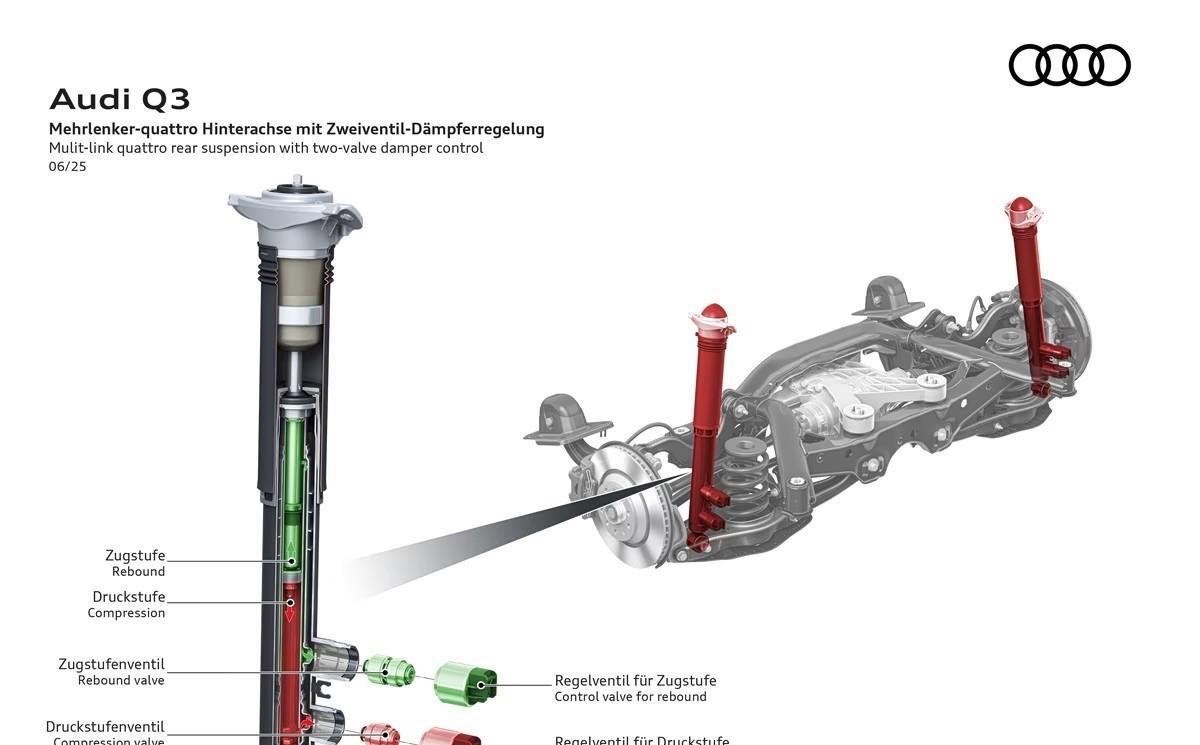 底盘方面,奥迪Q3没能完成结构性升级,依旧是前麦弗逊+后多连杆式独立悬架。不过,新车增加了带双阀减震器控制技术的自适应悬架,不同驾驶模式下的针对性改善会更到位一些,至于说能不能真的兼顾操控乐趣,那就要靠最终的实车检验了。