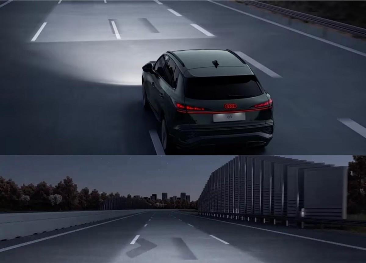 还需要提到的一点是,奥迪Q3的头灯在随动转向的过程中, 还能在路面投射出车宽,并能通过转向灯+大灯的配合来提示其他车辆本车的转向操作,而包括变道辅助等辅助驾驶功能也能通过不同灯光效果来进行展示,应该说跟辅助、安全功能的结合还是挺人性化的。